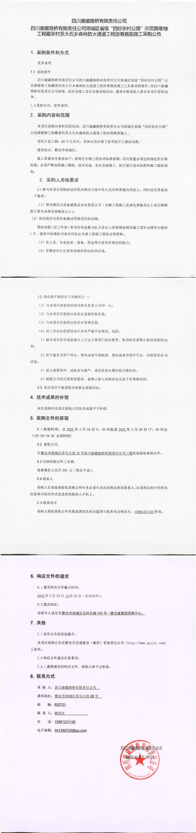 四川康藏路橋有限責(zé)任公司雨城區(qū)省級(jí)“四好農(nóng)村公路”示范路維修工程藏茶村至大石鄉(xiāng)森林防火通道工程瀝青路面施工采購(gòu)公告