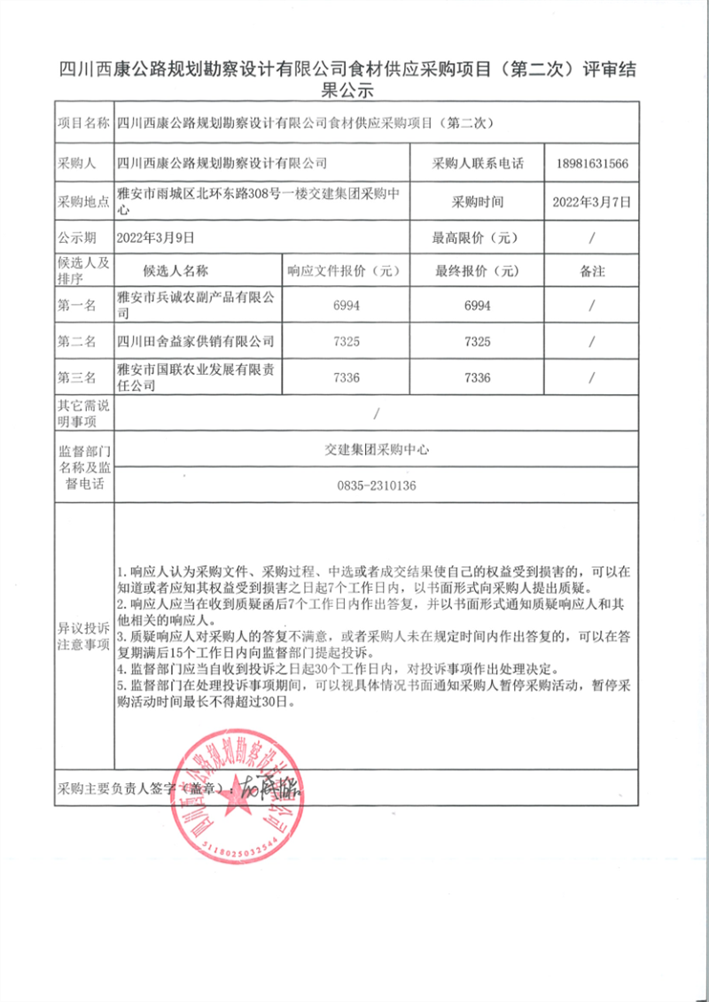 四川西康公路規(guī)劃勘察設計有限公司食材供應采購項目(第二次)評審結果公示