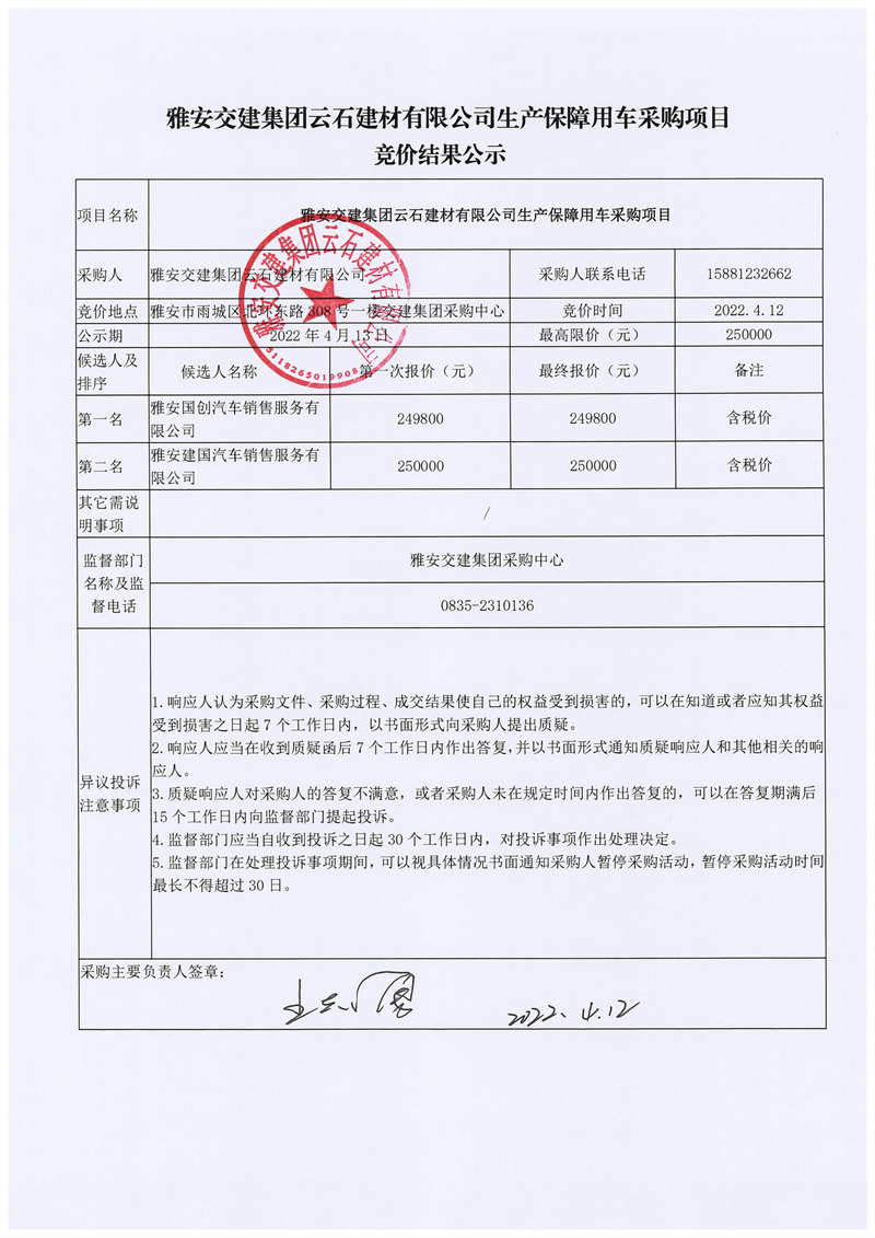 雅安交建集團云石建材有限公司生產(chǎn)保障用車采購項目競價結果公示
