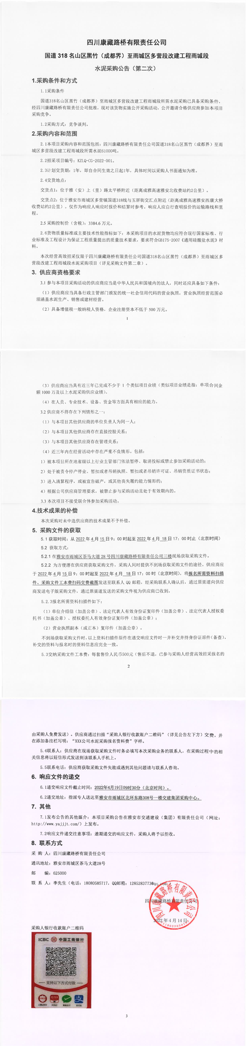 四川康藏路橋有限責(zé)任公司國道318名山區(qū)黑竹(成都界)至雨城區(qū)多營段改建工程雨城段水泥采購公告(第二次)