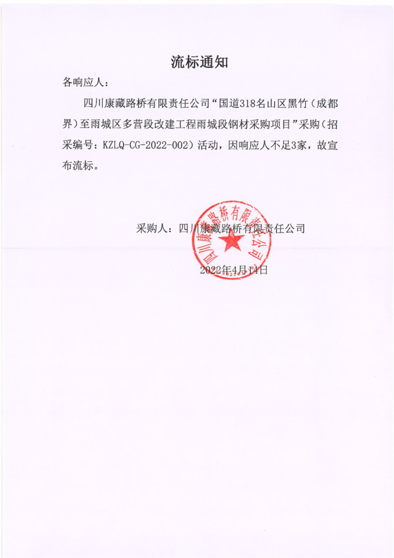 四川康藏路橋有限責任公司國道318名山區(qū)黑竹(成都界)至雨城區(qū)多營段改建工程雨城段鋼材采購項目流標通知