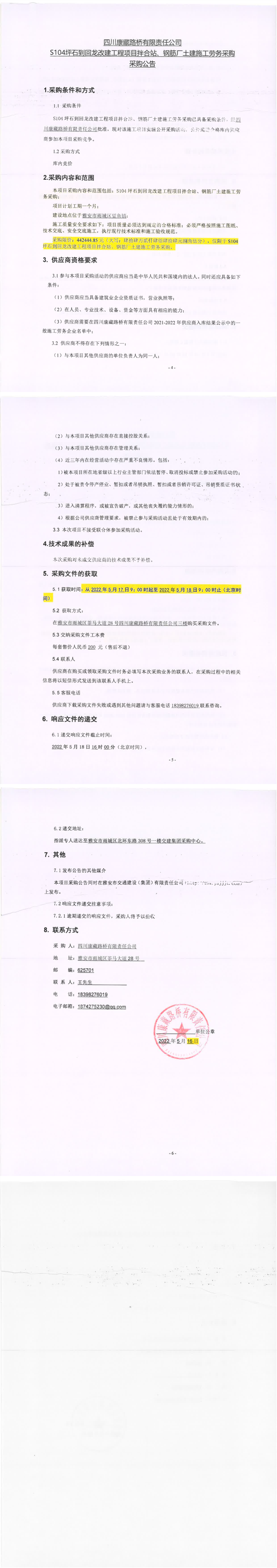 四川康藏路橋有限責(zé)任公司S104坪石到回龍改建工程項(xiàng)目拌合站、鋼筋廠土建施工勞務(wù)采購采購公告