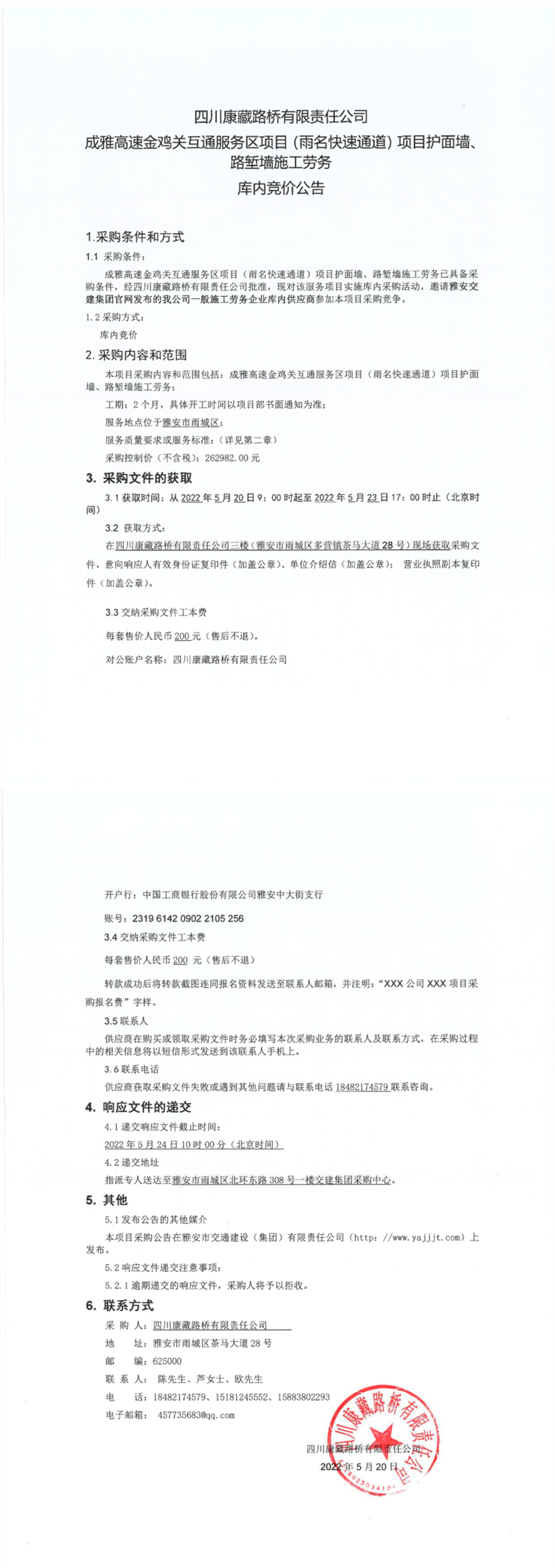 四川康藏路橋有限責任公司成雅高速金雞關互通服務區(qū)項目(雨名快速通道)項目護面墻、路塹墻施工勞務庫內競價公告