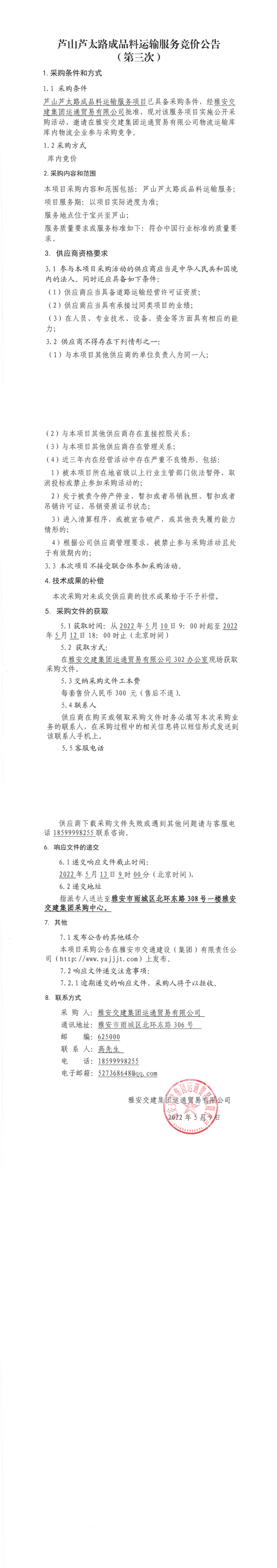 雅安交建集團(tuán)運通貿(mào)易有限公司蘆山蘆太路成品料運輸服務(wù)競價公告(第三次)