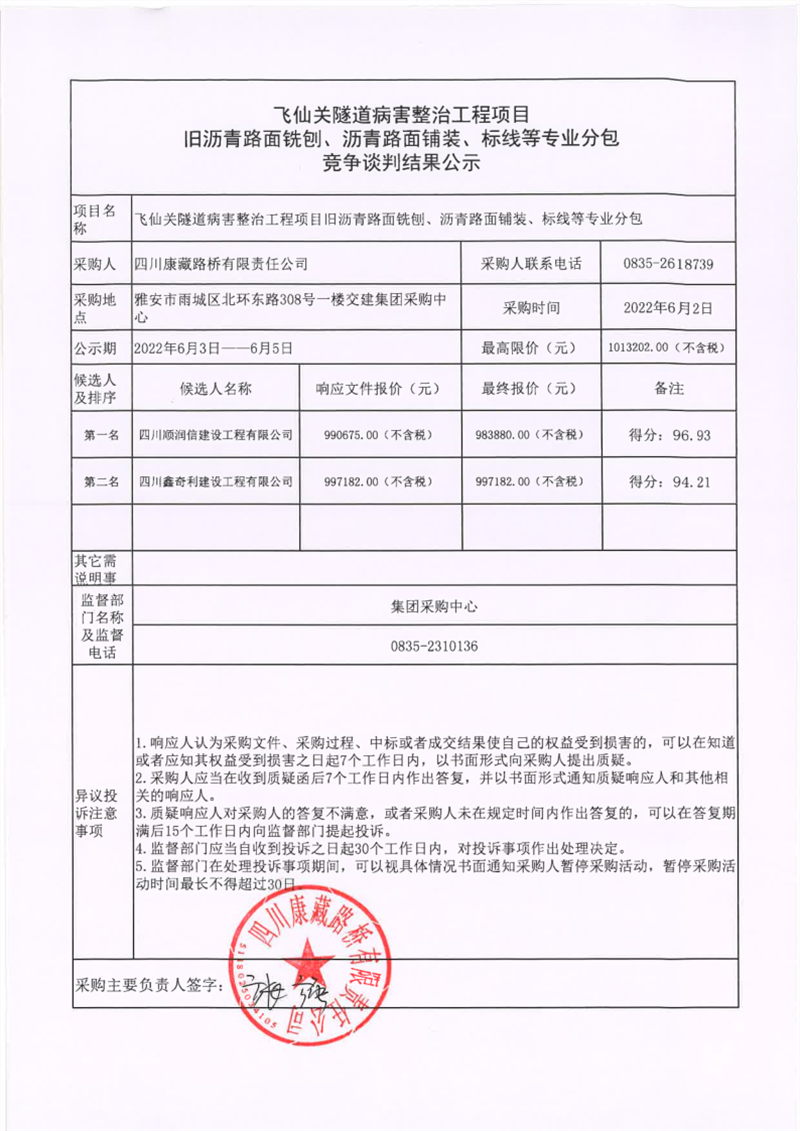四川康藏路橋有限責(zé)任公司飛仙關(guān)隧道病害整治工程項(xiàng)目舊瀝青路面銑刨、瀝青路面鋪裝、標(biāo)線等專業(yè)分包競(jìng)爭(zhēng)談判結(jié)果公示