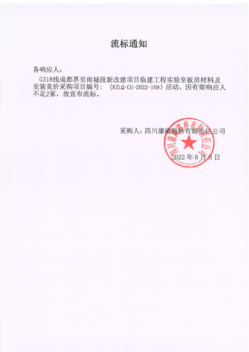 四川康藏路橋有限責任公司G318線成都界至雨城段新改建項目臨建工程實驗室板房材料及安裝采購流標通知