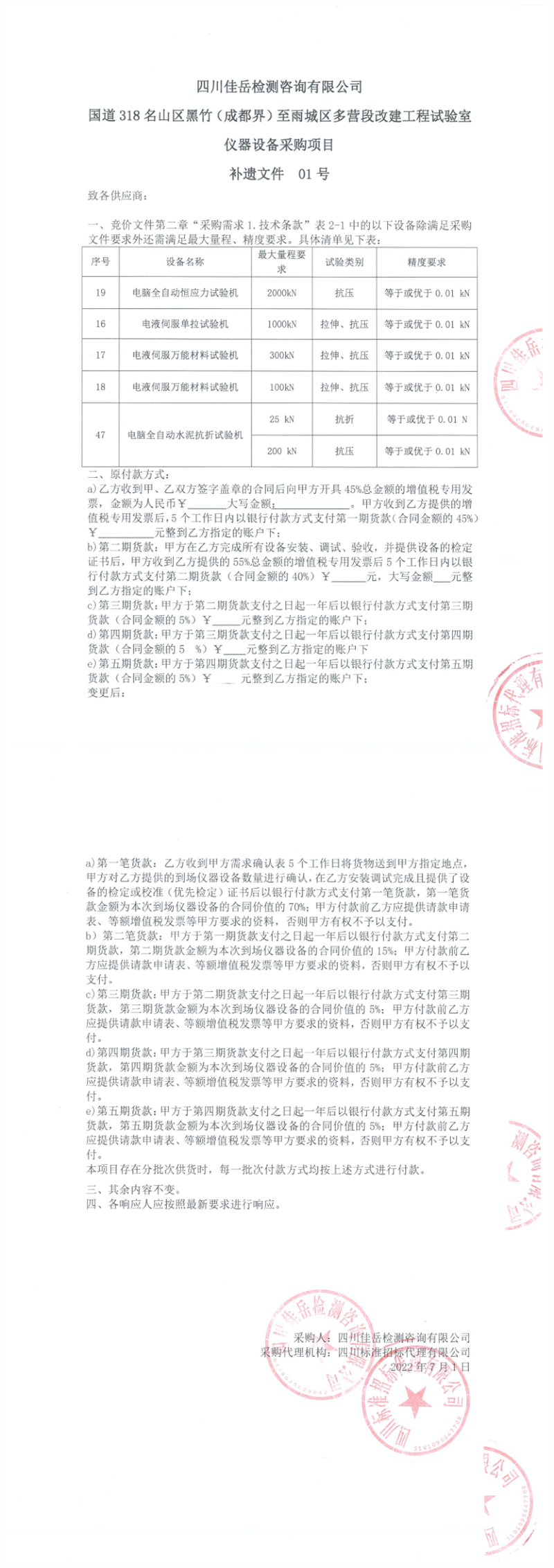 四川佳岳檢測咨詢有限公司國道318名山區(qū)黑竹(成都界)至雨城區(qū)多營段改建工程試驗(yàn)室儀器設(shè)備采購項(xiàng)目補(bǔ)遺文件01號