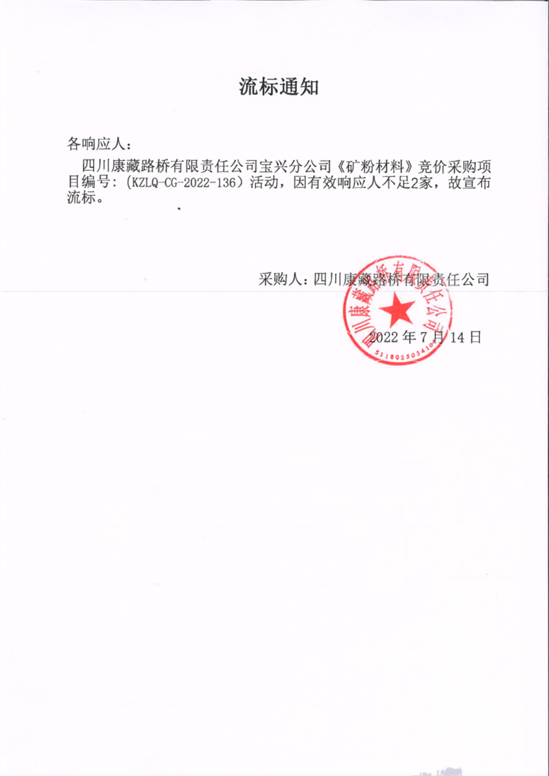 四川康藏路橋有限責(zé)任公司寶興分公司礦粉材料采購流標(biāo)通知