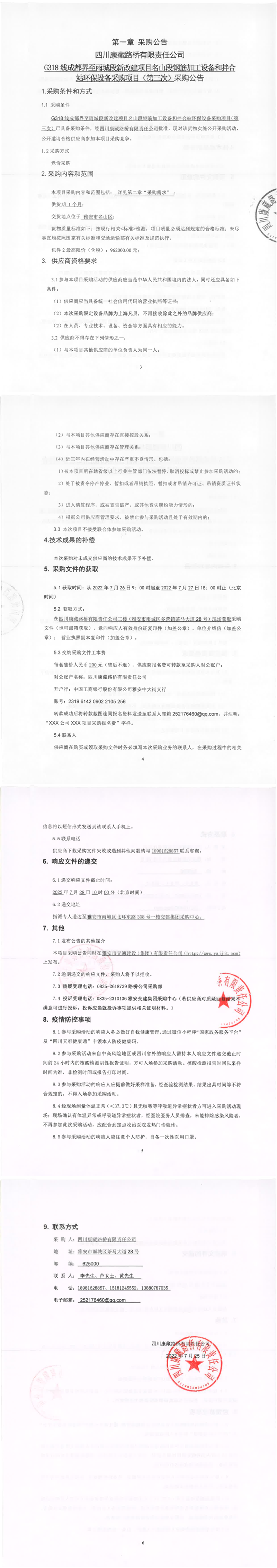 四川康藏路橋有限責任公司G318線成都界至雨城段新改建項目名山段鋼筋加工設(shè)備和拌合站環(huán)保設(shè)備采購項目(第三次)采購公告