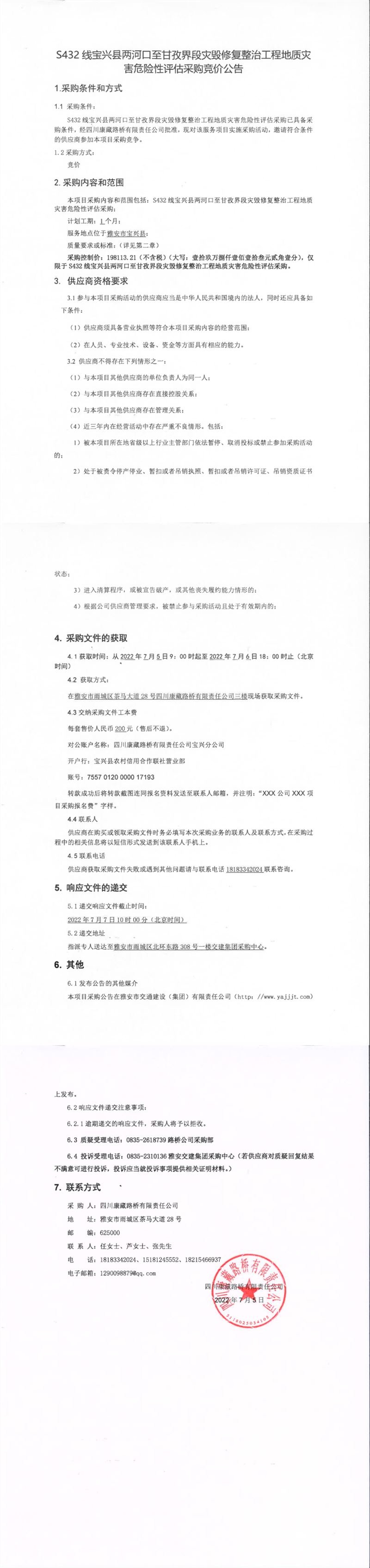 四川康藏路橋有限責(zé)任公司S432線寶興縣兩河口至甘孜界段災(zāi)毀修復(fù)整治工程地質(zhì)災(zāi)害危險性評估采購競價公告