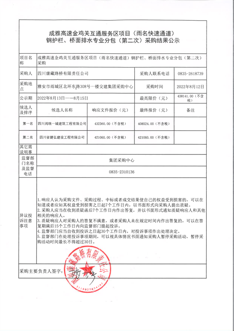 四川康藏路橋有限責任公司成雅高速金雞關(guān)互通服務(wù)區(qū)項目(雨名快速通道)鋼護欄、橋面排水專業(yè)分包(第二次)采購結(jié)果公示