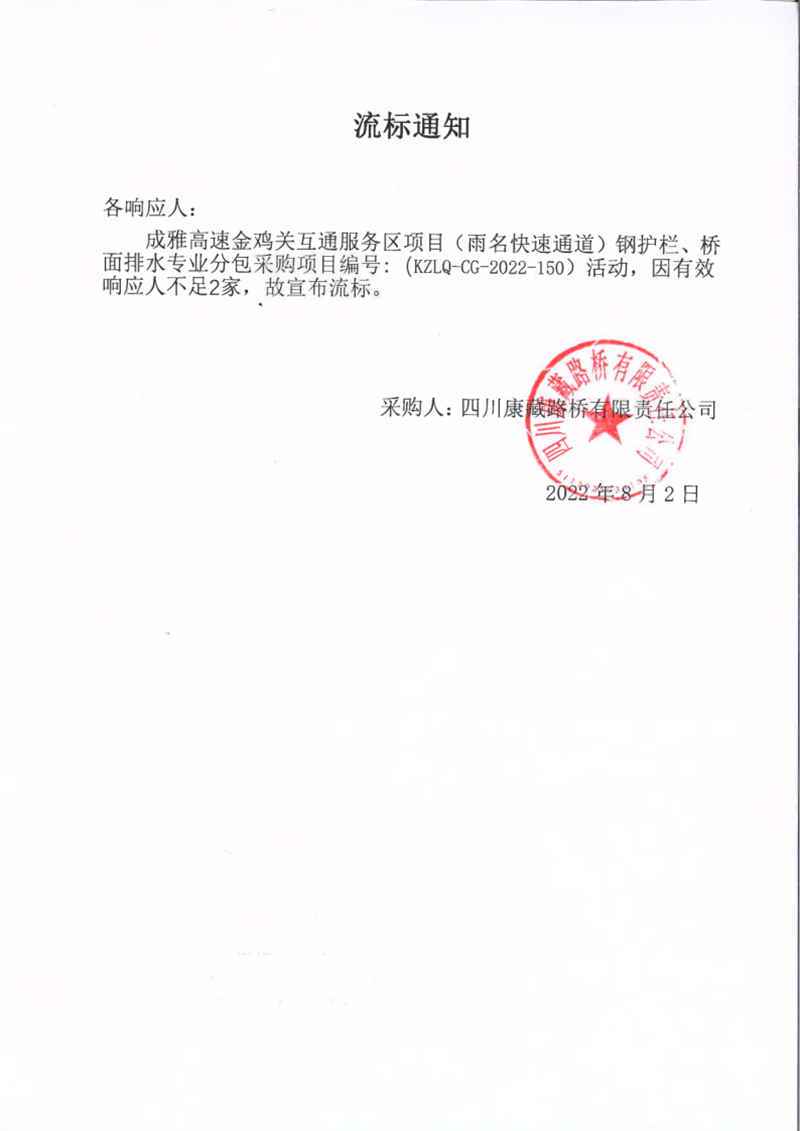 四川康藏路橋有限責(zé)任公司成雅高速金雞關(guān)互通服務(wù)區(qū)項目(雨名快速通道)鋼護(hù)欄、橋面排水專業(yè)分包采購項目流標(biāo)通知