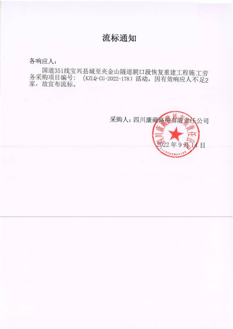 四川康藏路橋有限責(zé)任公司國(guó)道351線寶興縣城至夾金山隧道洞口段恢復(fù)重建工程施工勞務(wù)采購(gòu)流標(biāo)通知