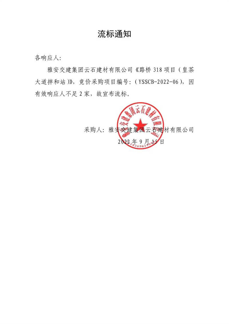 雅安交建集團(tuán)云石建材有限公司成品料運(yùn)輸服務(wù)采購(gòu)(皇茶大道拌和站)流標(biāo)通知