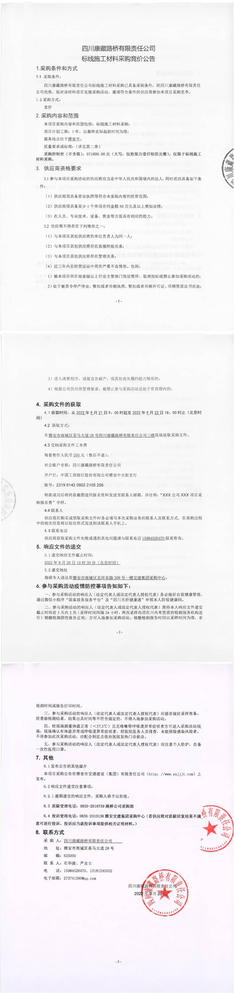 四川康藏路橋有限責(zé)任公司標(biāo)線施工材料采購競價(jià)公告