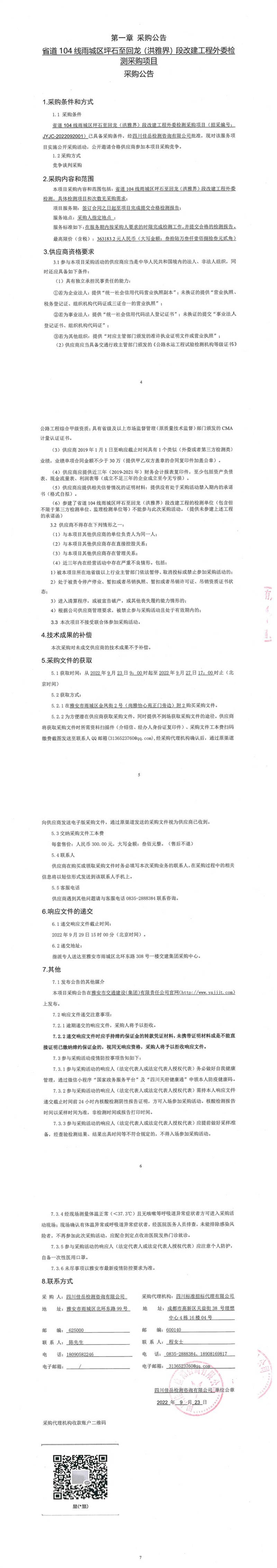 四川佳岳檢測咨詢有限公司省道104線雨城區(qū)坪石至回龍(洪雅界)段改建工程外委檢測采購項目采購公告