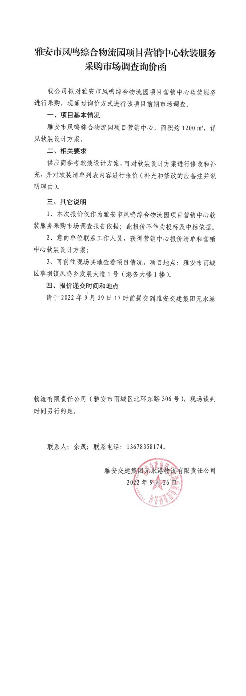 雅安交建集團(tuán)無水港物流有限責(zé)任公司雅安市鳳鳴綜合物流園項目營銷中心軟裝服務(wù)采購市場調(diào)查詢價函