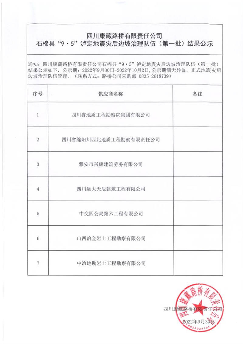 四川康藏路橋有限責(zé)任公司石棉縣“9.5”瀘定地震災(zāi)后邊坡治理隊(duì)伍(第一批)結(jié)果公示
