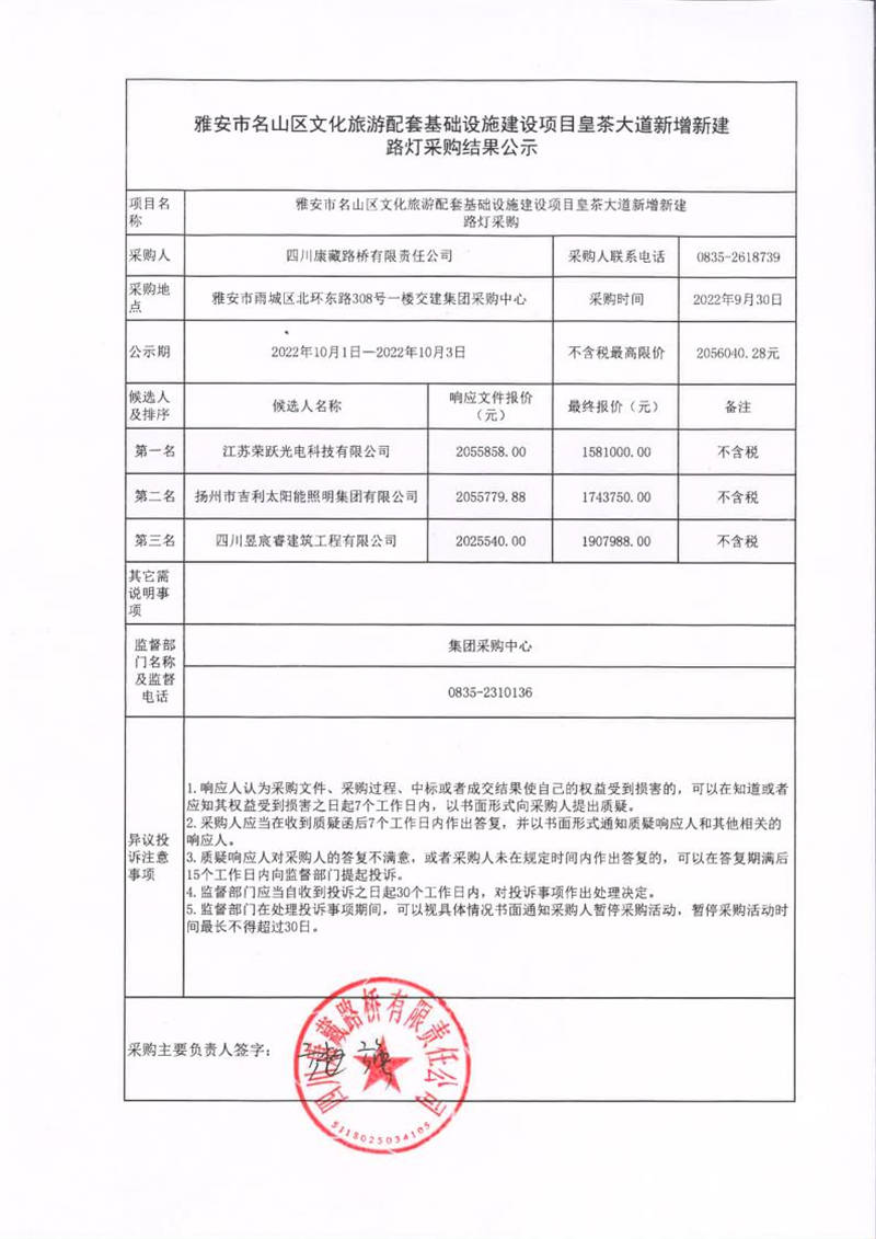 四川康藏路橋有限責(zé)任公司雅安市名山區(qū)文化旅游配套基礎(chǔ)設(shè)施建設(shè)項(xiàng)目皇茶大道新增新建路燈采購結(jié)果公示