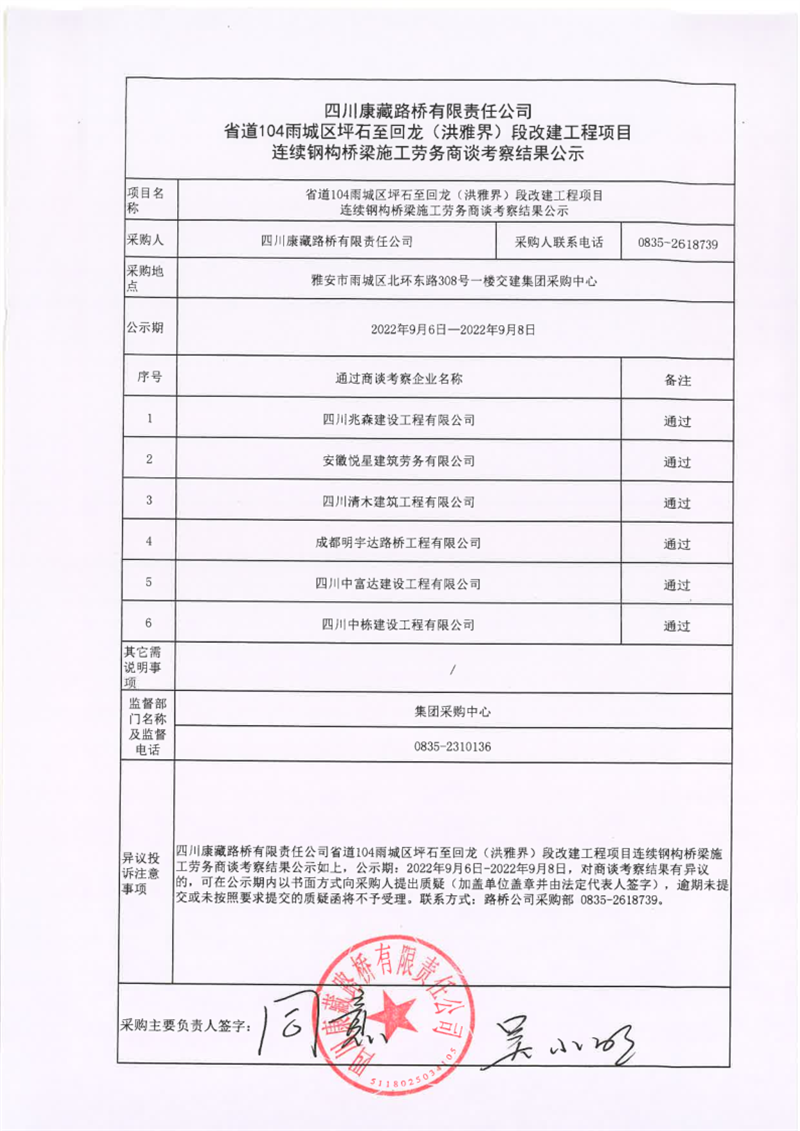 四川康藏路橋有限責任公司省道104雨城區(qū)坪石至回龍(洪雅界)段改建工程項目連續(xù)鋼構(gòu)橋梁施工勞務商談考察結(jié)果公示