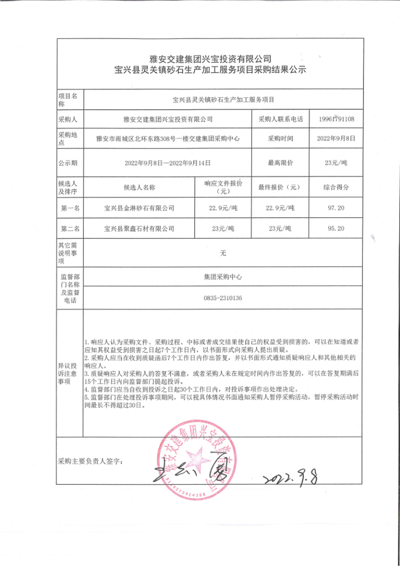 雅安交建集團(tuán)興寶投資有限公司寶興縣靈關(guān)鎮(zhèn)砂石生產(chǎn)加工服務(wù)項(xiàng)目采購(gòu)結(jié)果公示