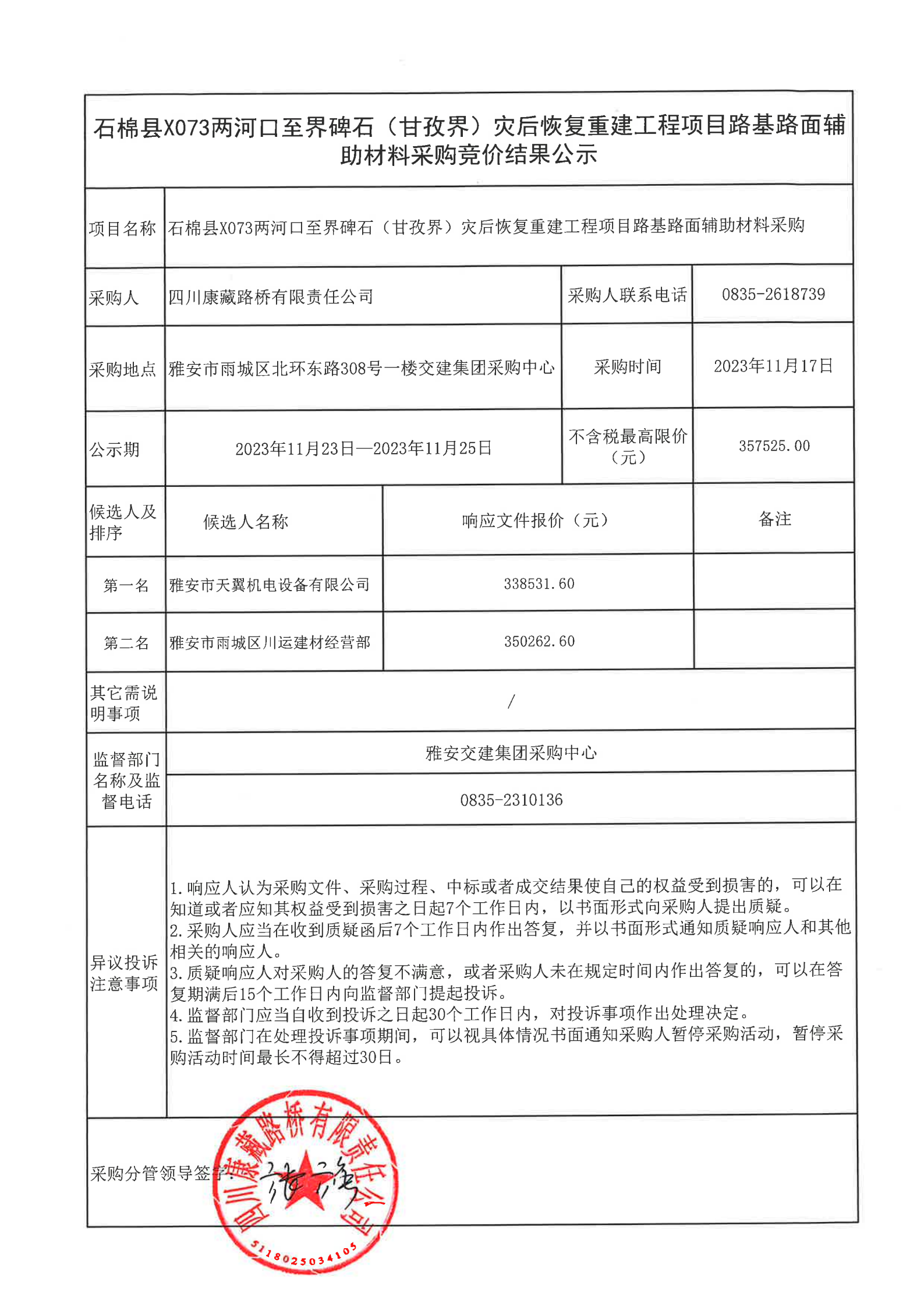 四川康藏路橋有限責(zé)任公司石棉縣X073兩河口至界碑石(甘孜界)災(zāi)后恢復(fù)重建工程項(xiàng)目路基路面輔助材料采購結(jié)果公示