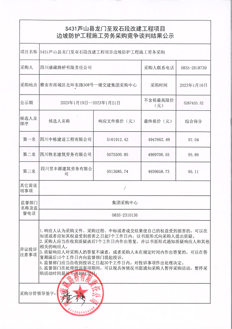 四川康藏路橋有限責任公司S431蘆山縣龍門至雙石段改建工程項目邊坡防護工程施工勞務采購競爭談判結果公示