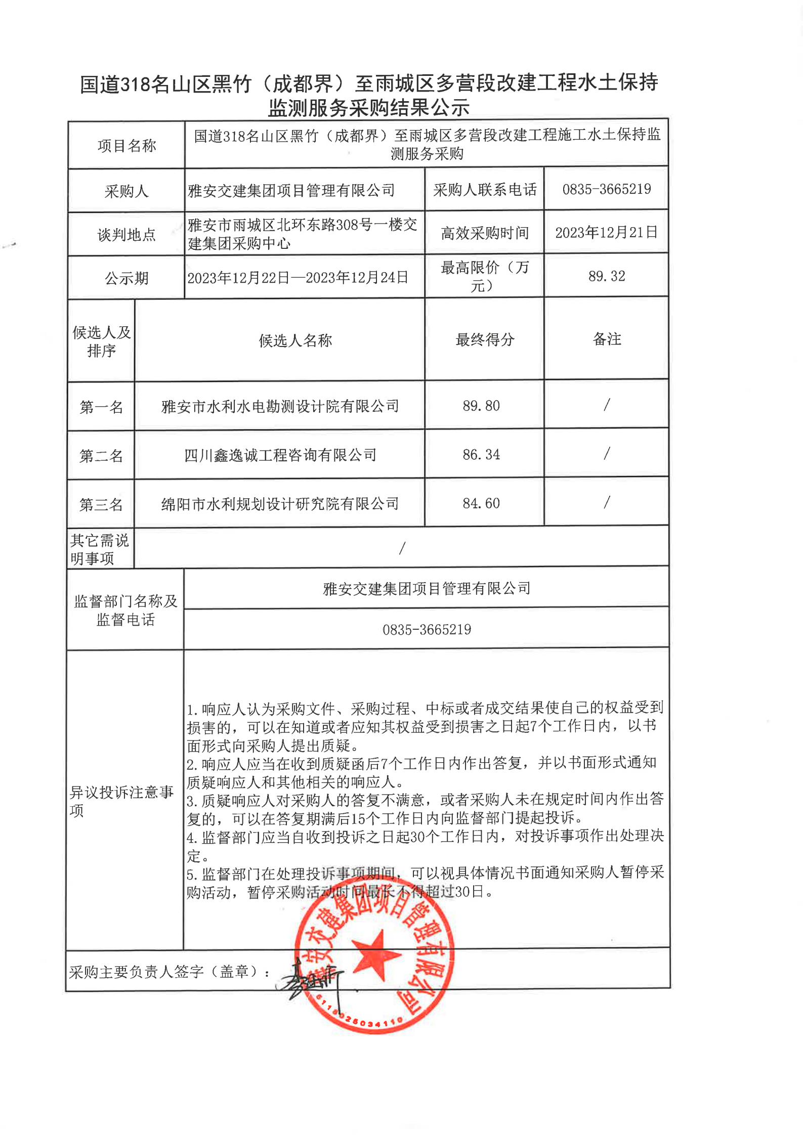 雅安交建集團項目管理有限公司國道318名山區(qū)黑竹(成都界)至雨城區(qū)多營段改建工程水土保持監(jiān)測服務采購結(jié)果公示