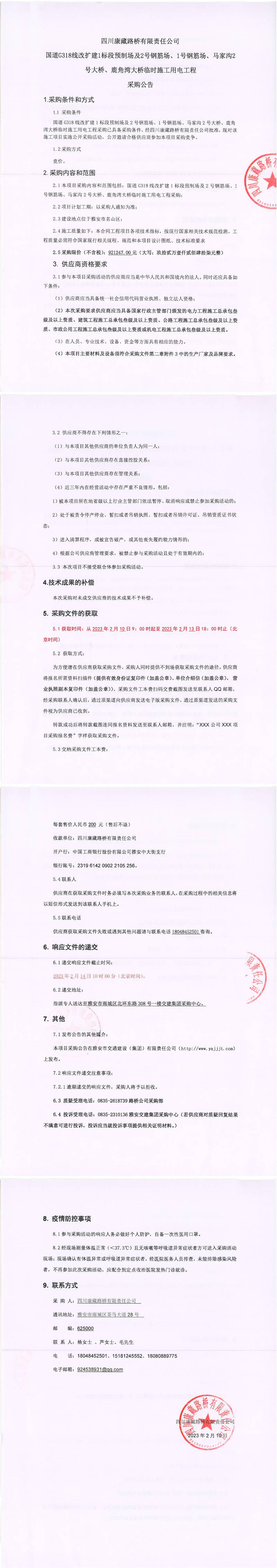 四川康藏路橋有限責(zé)任公司國道G318線改擴(kuò)建1標(biāo)段預(yù)制場及2號鋼筋場、1號鋼筋場、馬家溝2號大橋、鹿角灣大橋臨時施工用電工程采購公告