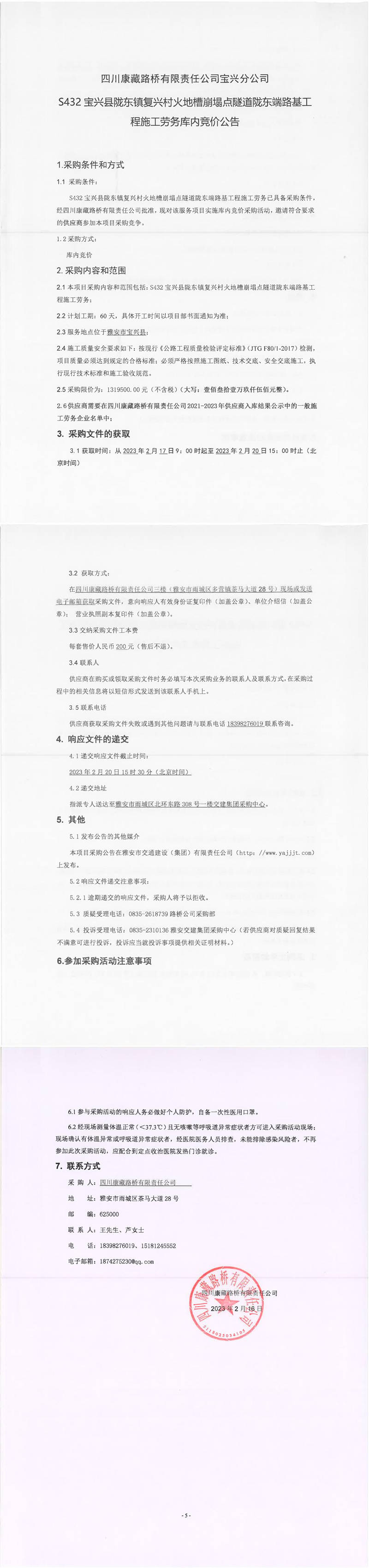 四川康藏路橋有限責任公司S432寶興縣隴東鎮(zhèn)復興村火地槽崩塌點隧道隴東端路基工程施工勞務庫內(nèi)競價公告