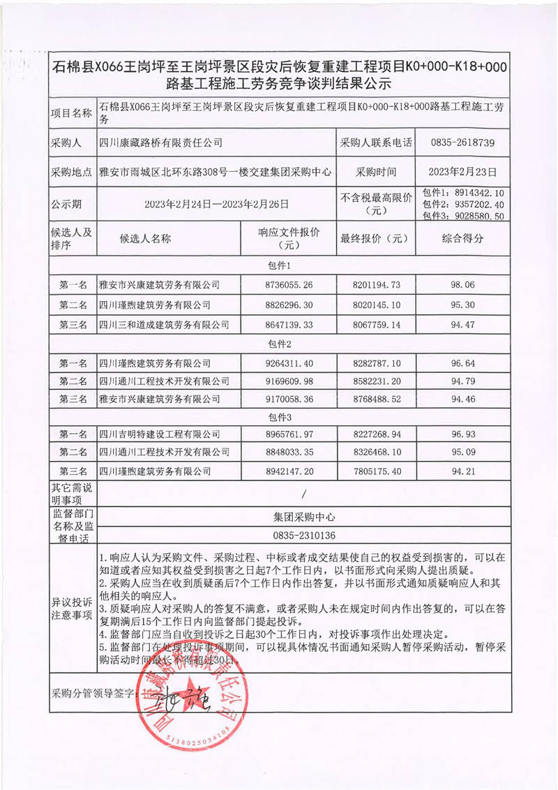四川康藏路橋有限責任公司石棉縣X066王崗坪至王崗坪景區(qū)段災后恢復重建工程項目土石方工程、排水工程、邊坡治理工程、防護工程施工勞務采購項目競爭談判結果公示