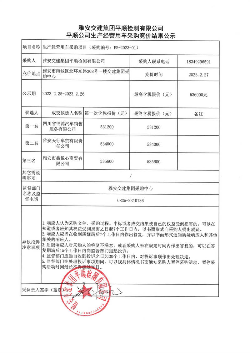 雅安交建集團(tuán)平順檢測有限公司平順公司生產(chǎn)經(jīng)營用車采購競價(jià)結(jié)果公示
