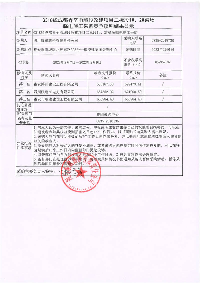 四川康藏路橋有限責(zé)任公司G318線成都界至雨城段改建項目二標(biāo)段1#、2#梁場臨電施工采購競爭談判結(jié)果公示