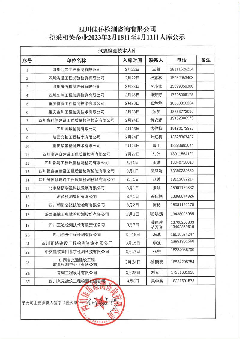 四川佳岳檢測咨詢有限公司(試驗檢測勞務(wù)供應(yīng)商庫)2023年2月18日至4月11日入庫結(jié)果公示