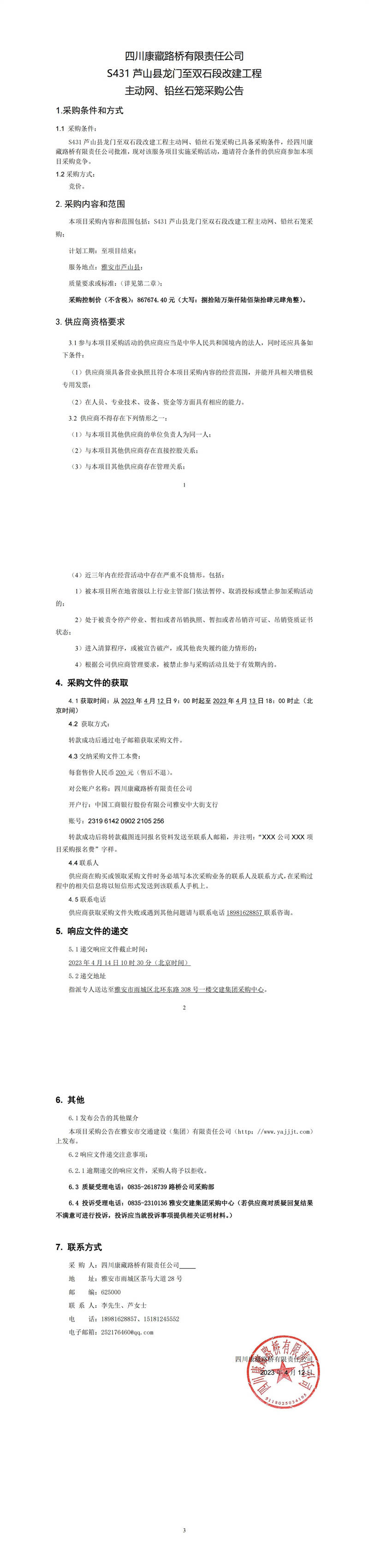 四川康藏路橋有限責(zé)任公司S431蘆山縣龍門至雙石段改建工程主動(dòng)網(wǎng)、鉛絲籠采購公告