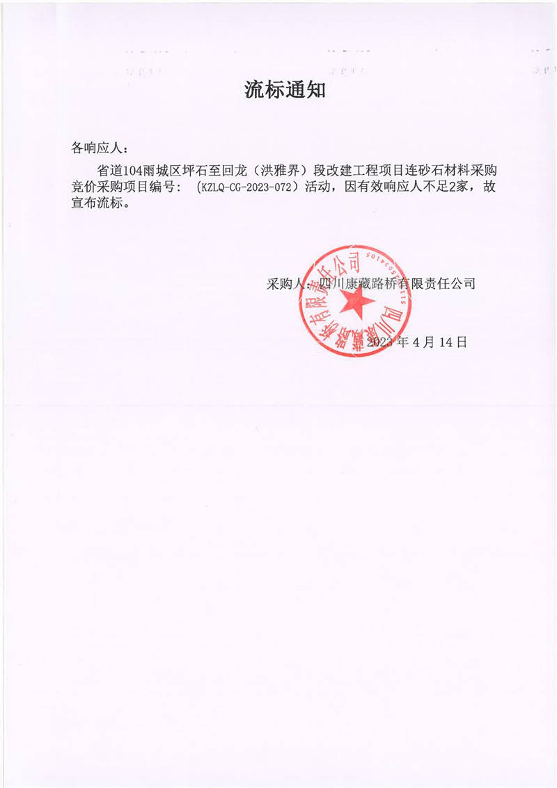 四川康藏路橋有限責(zé)任公司省道104雨城區(qū)坪石至回龍(洪雅界)段改建工程項目連砂石材料采購流標通知