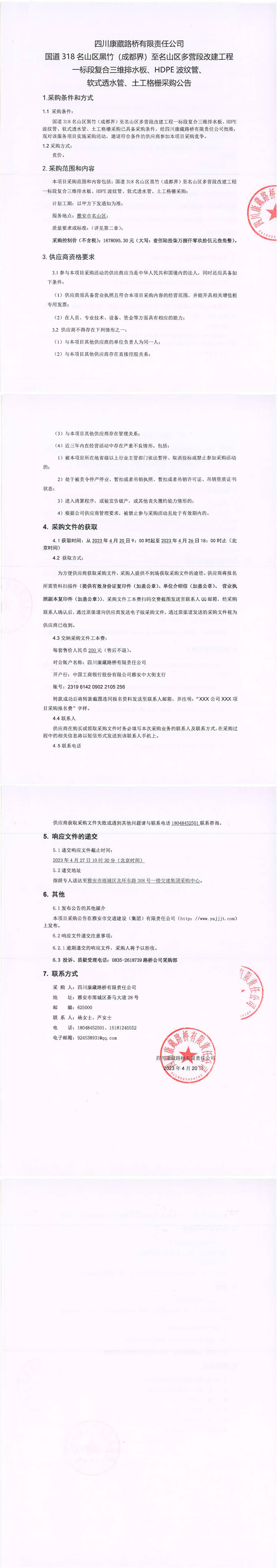 四川康藏路橋有限責(zé)任公司國(guó)道318名山區(qū)黑竹(成都界)至雨城區(qū)多營(yíng)段改建工程一標(biāo)段復(fù)合三維排水板、HDPE波紋管、軟式透水管、土工格柵采購(gòu)公告