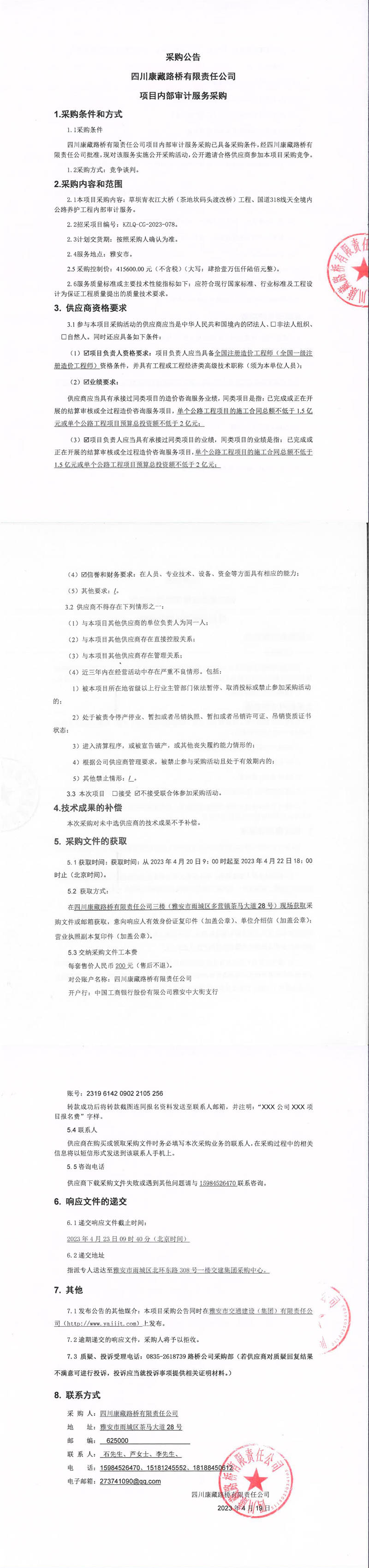 四川康藏路橋有限責(zé)任公司項(xiàng)目?jī)?nèi)部審計(jì)服務(wù)采購(gòu)公告