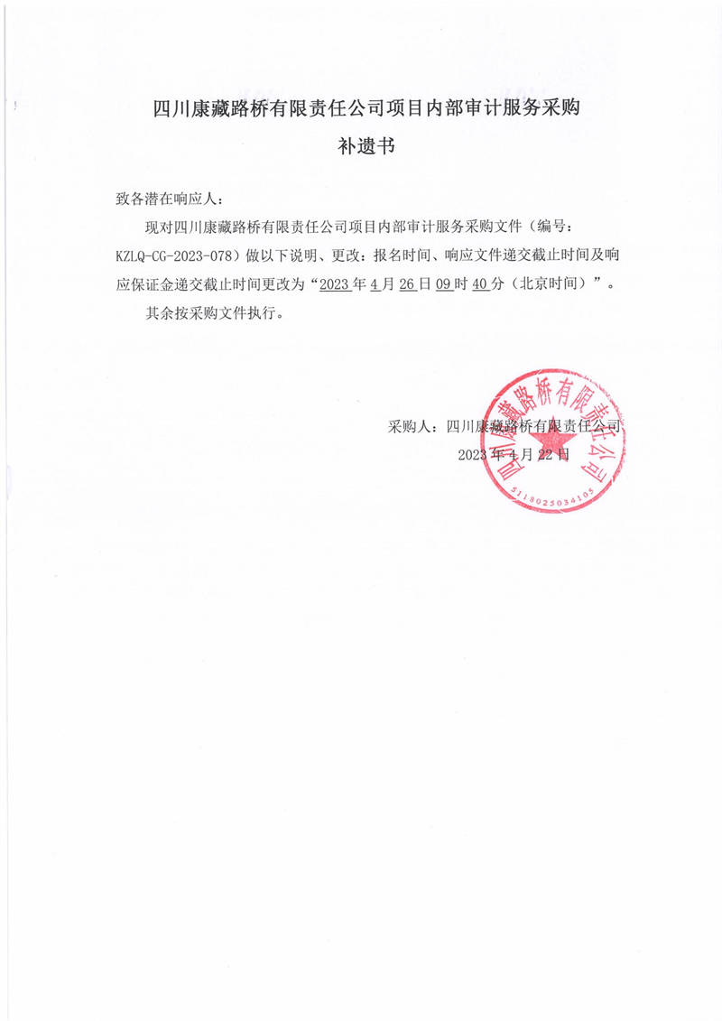 四川康藏路橋有限責(zé)任公司項(xiàng)目?jī)?nèi)部審計(jì)服務(wù)采購(gòu)補(bǔ)遺書(shū)