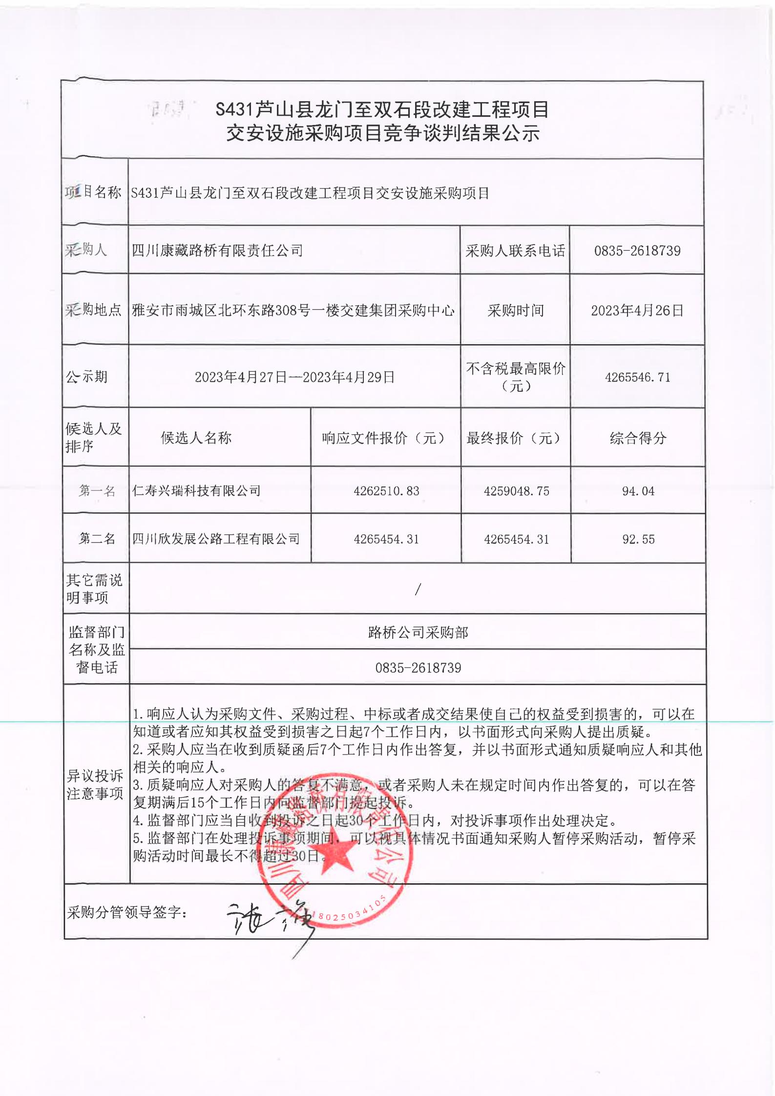 四川康藏路橋有限責(zé)任公司S431蘆山縣龍門(mén)至雙石段改建工程項(xiàng)目交安設(shè)施采購(gòu)項(xiàng)目競(jìng)爭(zhēng)談判結(jié)果公示