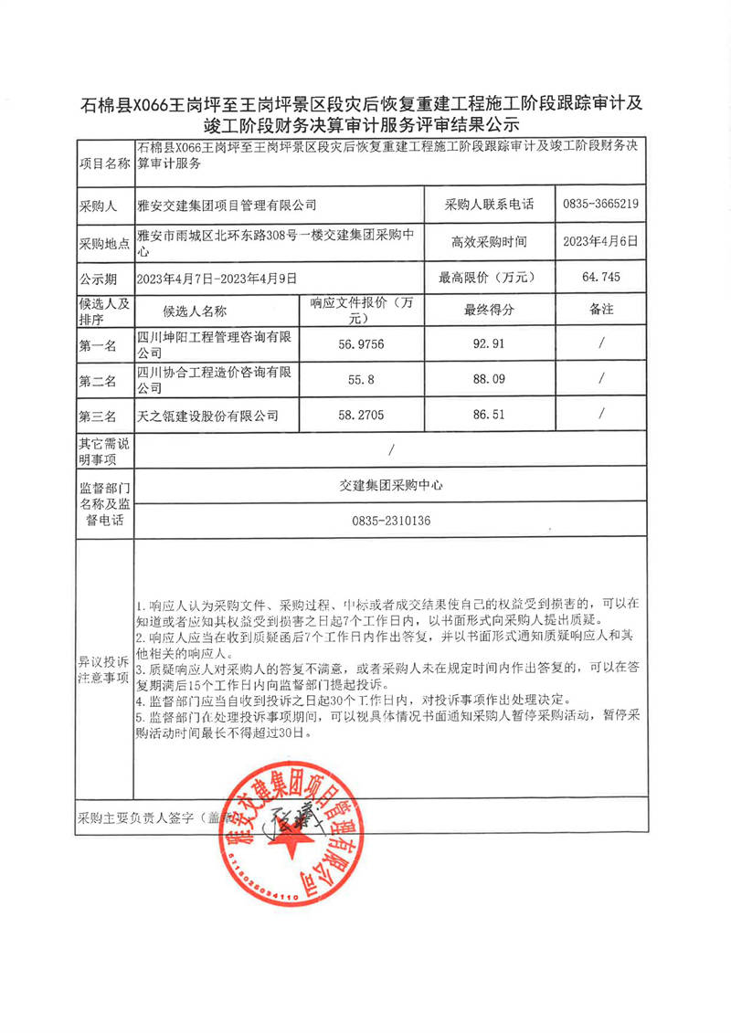 雅安交建集團(tuán)項(xiàng)目管理有限公司石棉縣X066王崗坪至王崗坪景區(qū)段災(zāi)后恢復(fù)重建工程施工階段跟蹤審計(jì)及竣工階段財(cái)務(wù)決算審計(jì)服務(wù)評(píng)審結(jié)果公示