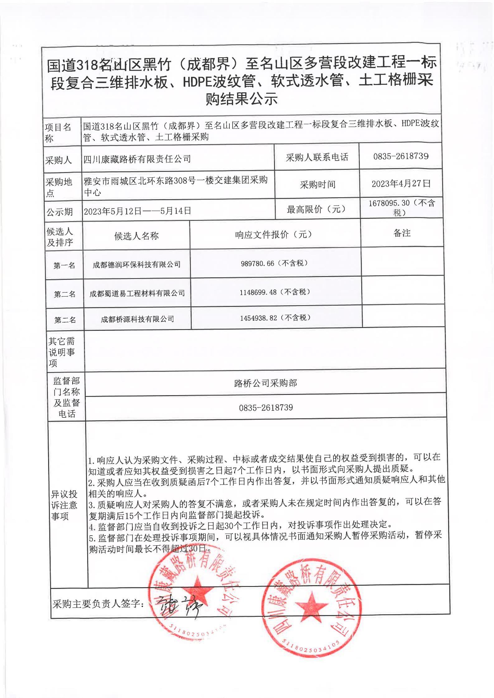 四川康藏路橋有限責任公司國道318名山區(qū)黑竹(成都界)至雨城區(qū)多營段改建工程一標段復合三維排水板、HDPE波紋管、軟式透水管、土工格柵采購結(jié)果公示