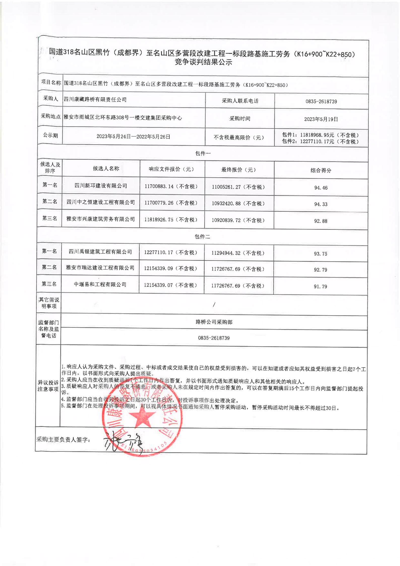 四川康藏路橋有限責任公司國道318名山區(qū)黑竹(成都界)至雨城區(qū)多營段改建工程一標段路基施工勞務(K16+900~K22+850)競爭談判結果公示