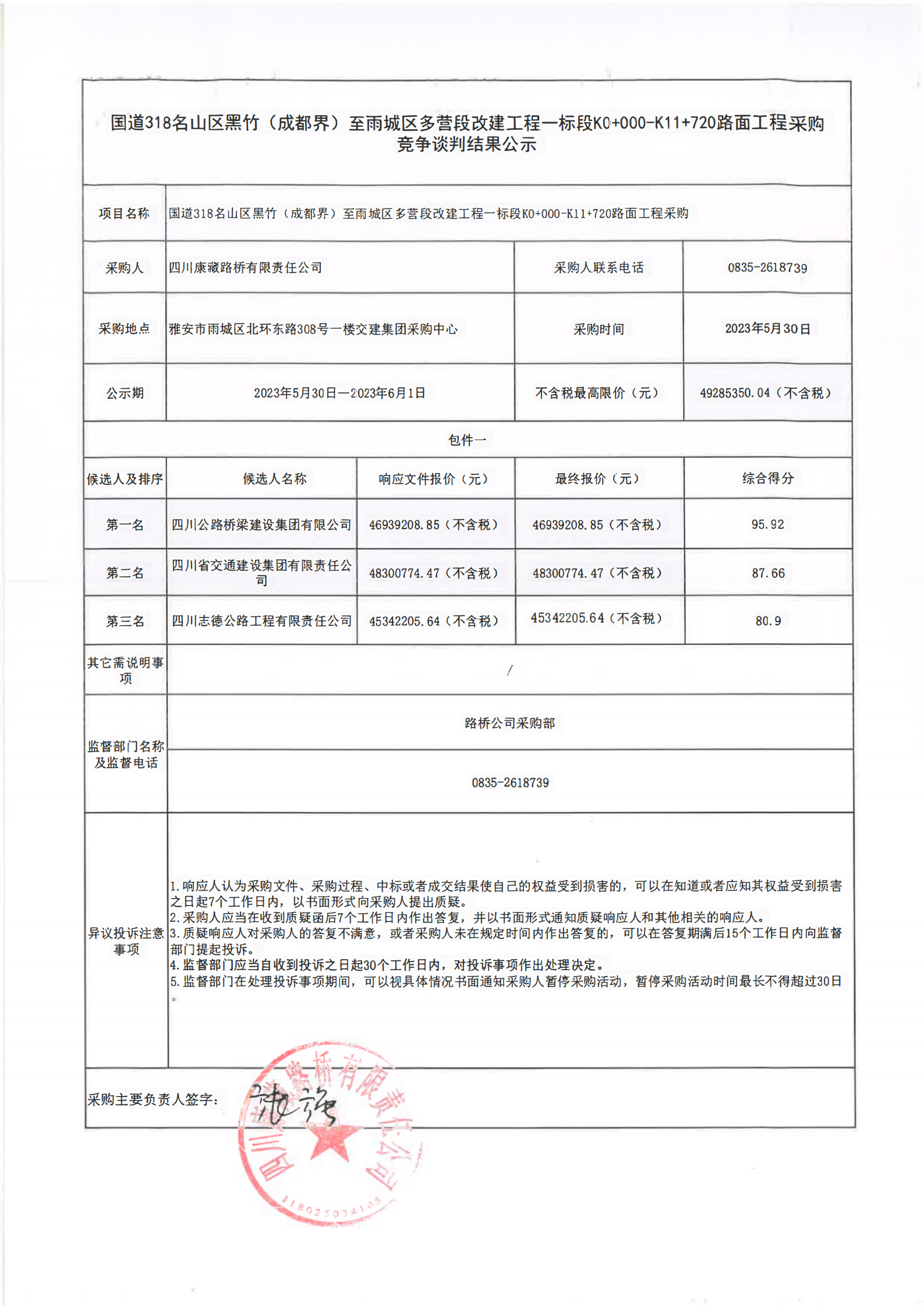 四川康藏路橋有限責任公司國道318名山區(qū)黑竹(成都界)至雨城區(qū)多營段改建工程一標段K0+000-K11+720路面工程采購競爭談判結(jié)果公示