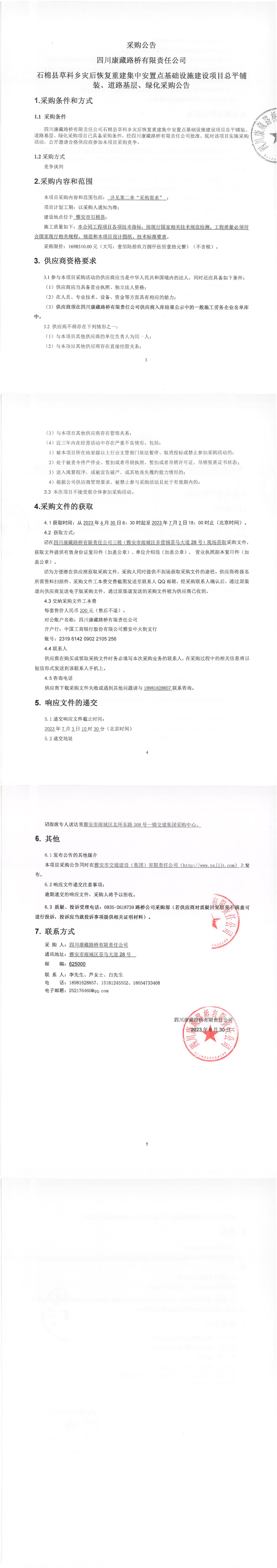 四川康藏路橋有限責(zé)任公司石棉縣草科鄉(xiāng)災(zāi)后恢復(fù)重建集中安置點(diǎn)基礎(chǔ)設(shè)施建設(shè)項(xiàng)目總平鋪裝、道路基層、綠化采購(gòu)公告