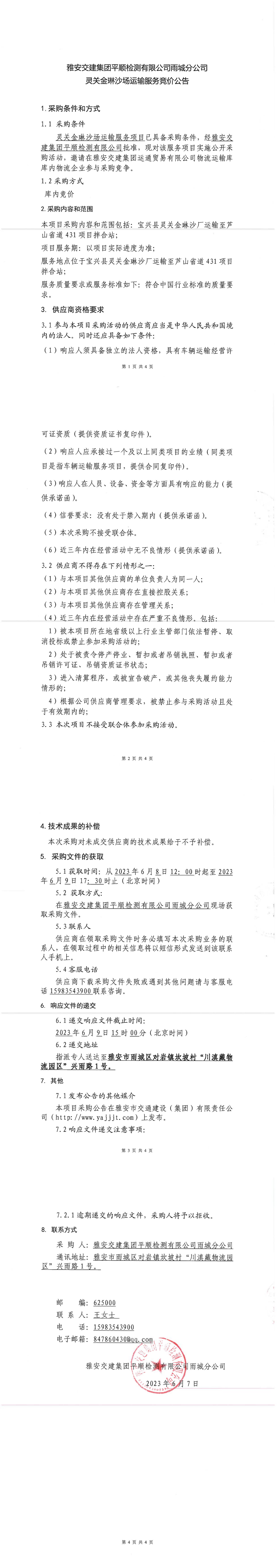 雅安交建集團(tuán)平順檢測(cè)有限公司雨城分公司靈關(guān)金琳沙場(chǎng)運(yùn)輸服務(wù)競(jìng)價(jià)公告