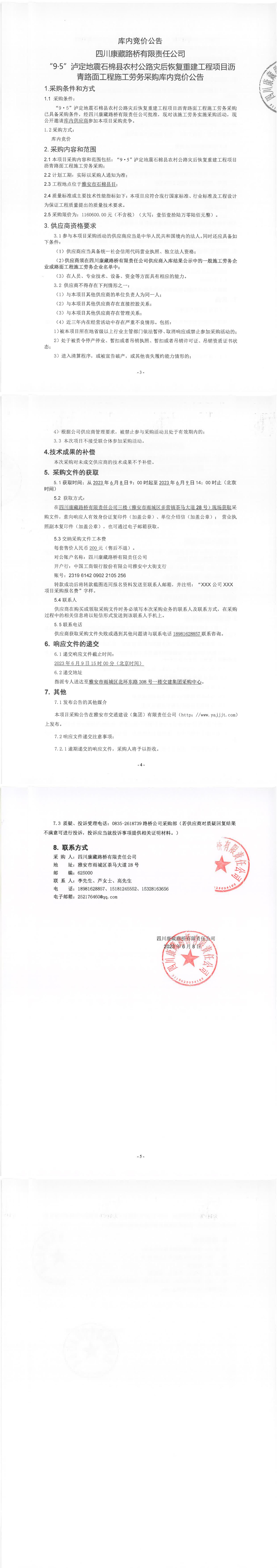 四川康藏路橋有限責(zé)任公司“9·5”瀘定地震石棉縣農(nóng)村公路災(zāi)后恢復(fù)重建工程項(xiàng)目瀝青路面工程施工勞務(wù)采購庫內(nèi)競價(jià)公告