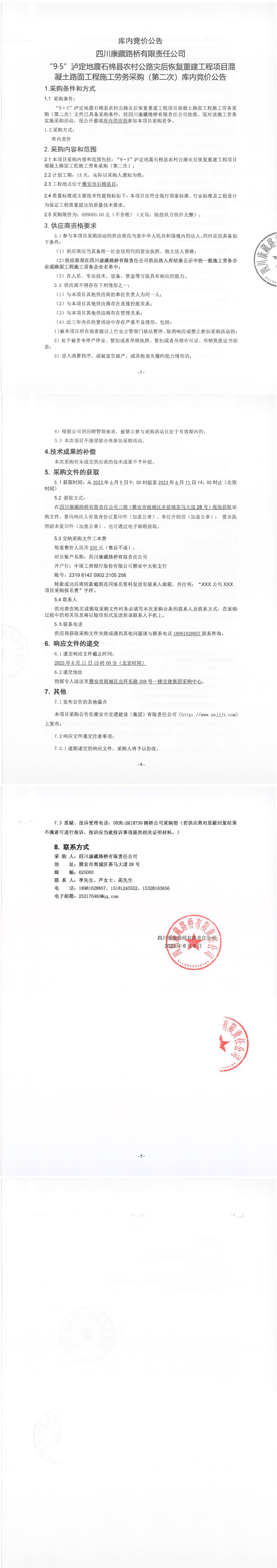 四川康藏路橋有限責(zé)任公司“9·5”瀘定地震石棉縣農(nóng)村公路災(zāi)后恢復(fù)重建工程項(xiàng)目混凝土路面工程施工勞務(wù)采購(gòu)(第二次)庫(kù)內(nèi)競(jìng)價(jià)公告