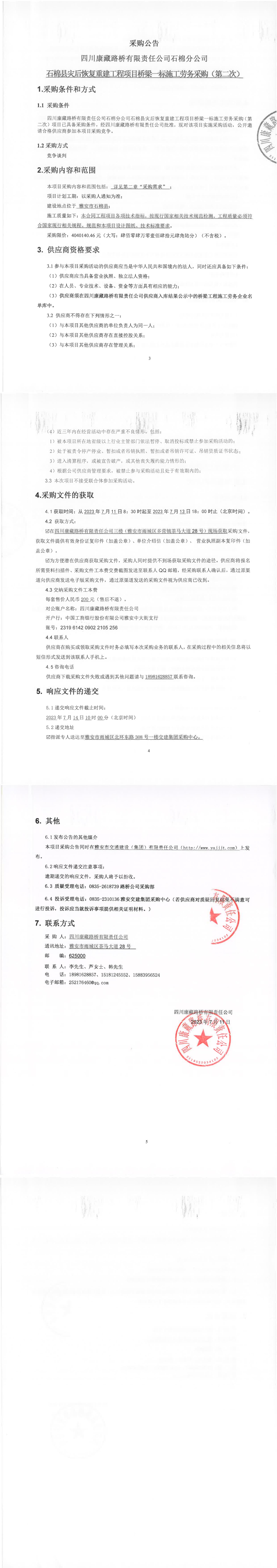 四川康藏路橋有限責(zé)任公司石棉縣災(zāi)后恢復(fù)重建工程項(xiàng)目橋梁一標(biāo)段施工勞務(wù)采購(gòu)(第二次)