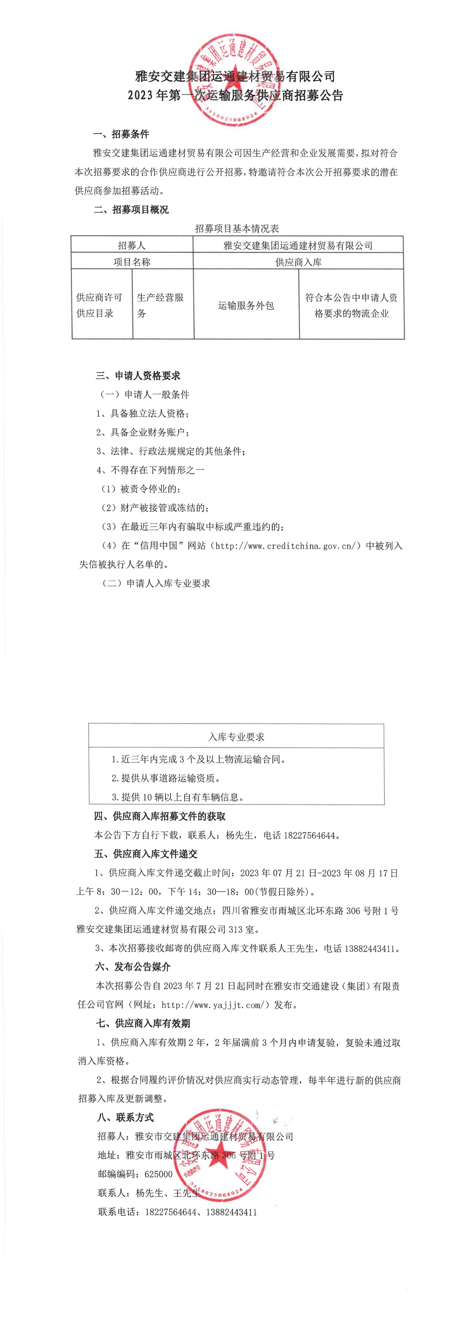 雅安交建集團運通建材貿(mào)易有限公司2023年第一次運輸服務(wù)供應(yīng)商招募公告